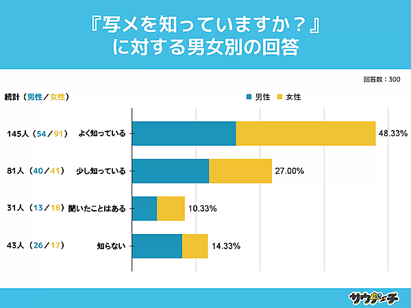 まず「写メを知っていますか?」と聞くと「よく知っている」48.33%が最多。以下「少し知っている」27%、「知らない」14.33%、「聞いたことはある」10.33%と続く。