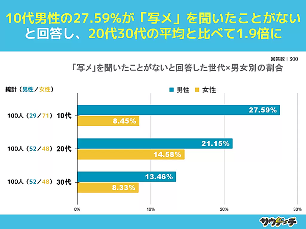 「写メを聞いたことがない・知らない」の回答を世代・男女別で見ると、「10代男性」27.59%が最も多く、20代・30代平均と比べてほぼ倍だった。