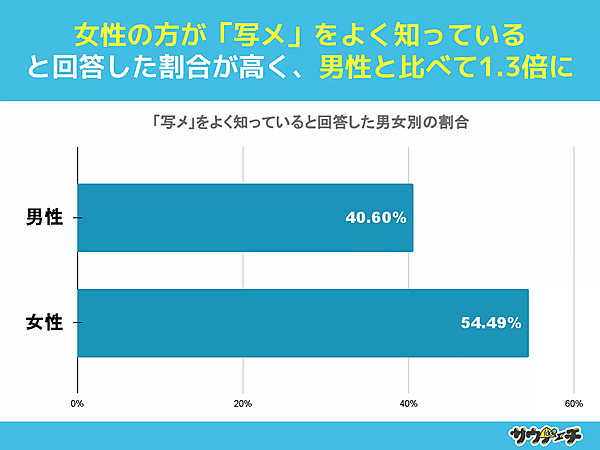 逆に「写メをよく知っている」の回答を男女別で見ると、男性が40.60%、女性が54.49%で、女性のほうが1.3倍高かった。女性から支持された初期Instagramなどを、写メ文化から発展したと考えることもできるだろう。
