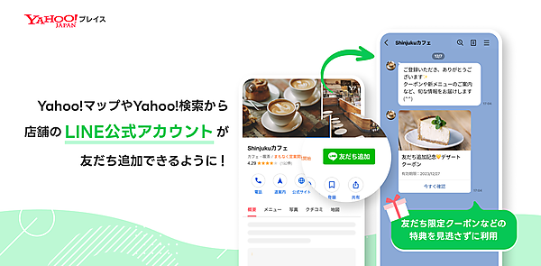 友だち追加ボタンの表示は、Yahoo!マップが12月19日以降、Yahoo!検索は近日中を予定する。LINE公式アカウントとの連携を強めたことで、Yahoo!マップやYahoo!検索の利用者は、店舗や施設などのLINE公式アカウントに気付きやすくなり、容易に友だち追加が可能。店舗や施設がLINEの友だちに向けて限定配信するクーポンなどの特典を見逃すことなく便利に使える。