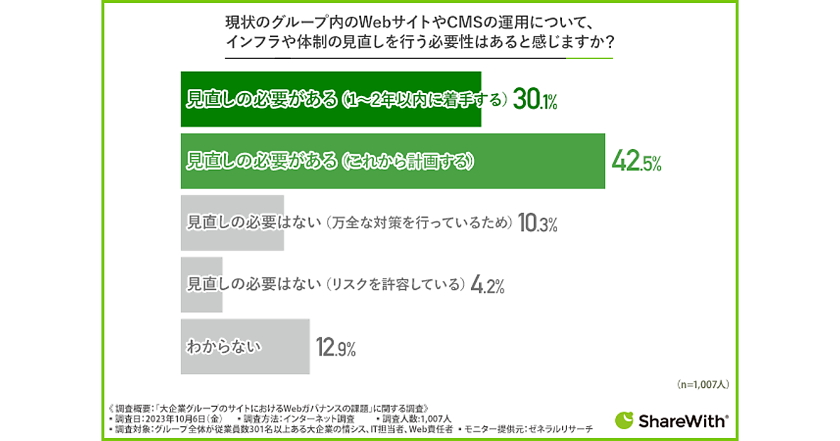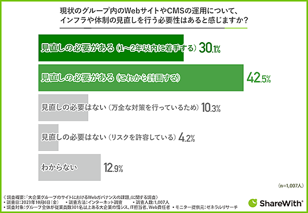 まず「現状のグループ内のWebサイト・CMSの運用について、インフラや体制の見直しを行う必要性」と聞くと、「見直しの必要がある(1~2年以内に着手する)」30.1%、「見直しの必要がある(これから計画する)」42.5%で、見直しの必要があるという回答は7割を超えた。