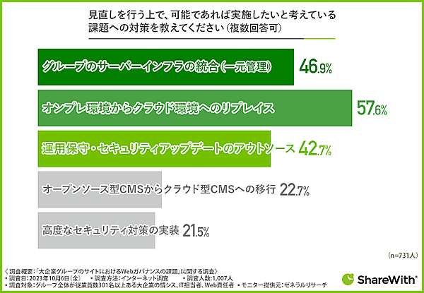 次に「見直しの必要がある」と回答した731人に、「見直しを行う上で、可能であれば実施したいと考えている課題への対策(複数回答可)」を聞くと、「オンプレ環境からクラウド環境へのリプレイス」57.6%が最多。以下「グループのサーバインフラの統合(一元管理)」46.9%、「運用保守・セキュリティアップデートのアウトソース」42.7%が続いた。