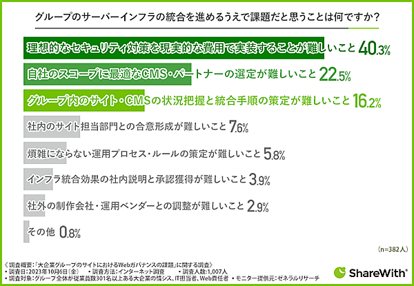 さらに「グループのサーバインフラの統合(一元管理)」と回答した382人に「グループのサーバインフラの統合を進めるうえでの課題」を聞くと、「理想的なセキュリティ対策を現実的な費用で実装することが難しいこと」40.3%が最多。「自社のスコープに最適なCMS・パートナーの選定が難しいこと」22.5%、「グループ内のサイト・CMSの状況把握と統合手順の策定が難しいこと」16.2%など実務の困難さより、セキュリティとそのコスト負担が壁となって、対策を進められていないと言える。
