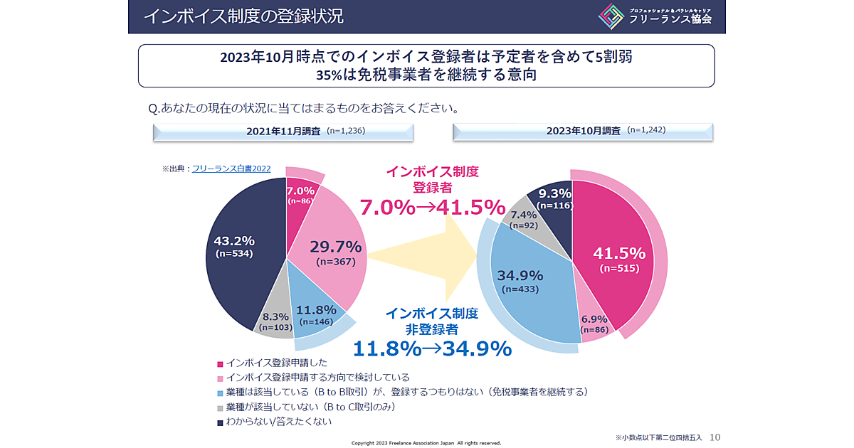 インボイス制度登録者の割合はこの2年で7.0%→41.5%に上昇。一方で制度開始後も免税事業者を継続する意思のある人は34.9%となった。