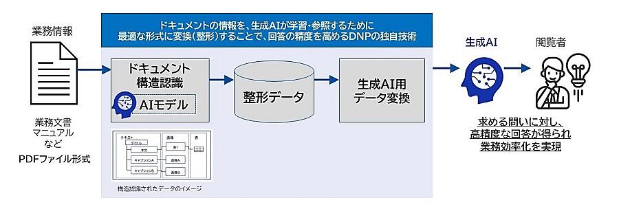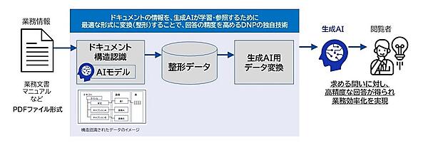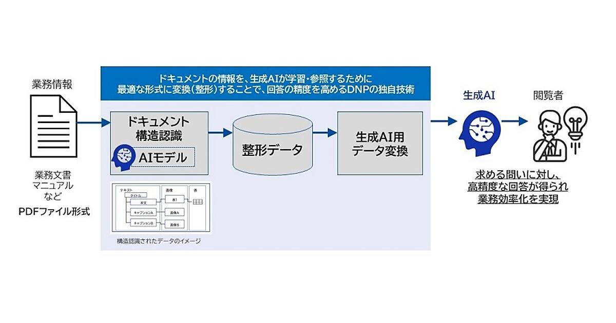 生成AIは回答精度の低さが課題で、外部から正しい知識、情報、データを与えることが有効とされている。政府も、生成AIの利用ルールを議論する「AI戦略会議」で政府保有のデータを開発者に提供する方針を決めている。ただ多くのデータがPDF形式で、生成AIが効果的に学習・参照するには情報を適切な形に整形する必要があった。この課題を解決するため、DNPは多様なドキュメントを生成AI向けのデータに整形する技術を開発した。