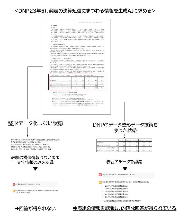テキスト、画像、表組みが混在したドキュメントから、タイトルや本文、画像や表の内容、キャプションなどの要素ごとにコンテンツを分割し、生成AIが学習しやすいデータ形式に整形する。大量の文書も高速に処理できる。DNPは、5月に生成AIを活用する社内環境を構築して、社内規定や品質マニュアル、決算短信などのドキュメントを整形して生成AIに学習させることで、誤回答を約90%削減することに成功した。