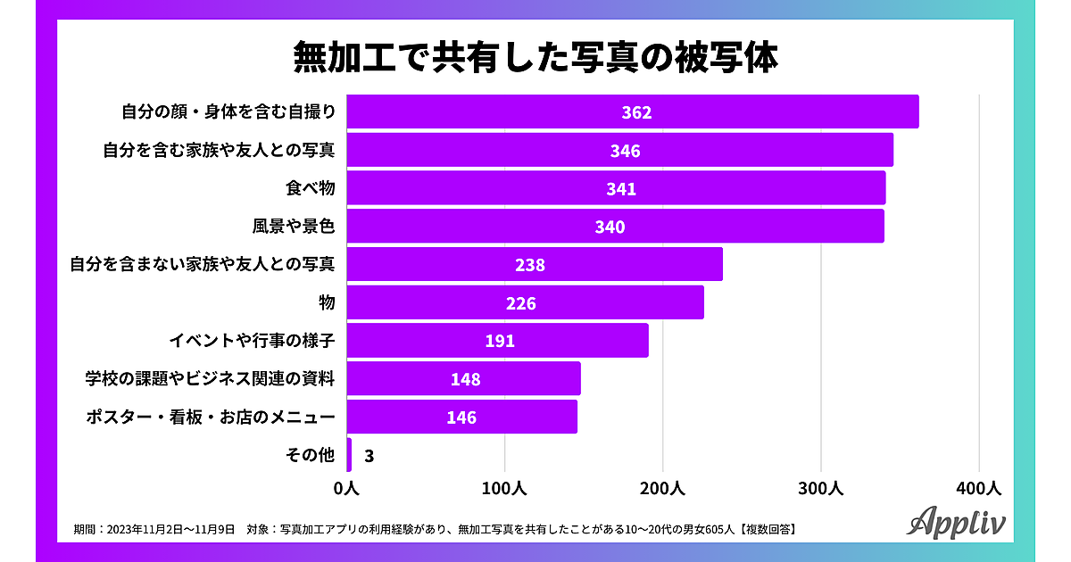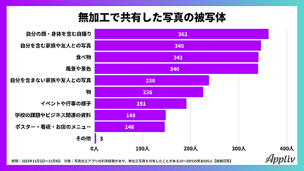 まず全体に「無加工で共有した写真の内容」を聞くと、「自分の顔・身体を含む自撮り」362人、「家族や友人との写真(自分を含む)」346人、「食べ物」341人、「風景や景色」340人が上位だった。このあたりは無加工・加工あり関係なく、共有されることが多いジャンルだろう。また300人を超えていることから、過半数が無加工でこれらを共有していることがわかる。