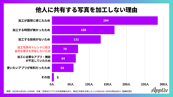「写真を加工しない理由」については「加工することが面倒に感じたため」284人が特に多く、「加工する時間がなくすぐに共有したかったため」168人、「加工する技術がないため」131人がそれに続く。“盛り”などといって加工やエフェクトを駆使した写真がZ世代には多いよう言われがちだが、実際には半分ほどの人が面倒と感じていた。また「加工写真のトレンドに飽き、自然な様子を共有したい」も70人と1割ほど存在する。