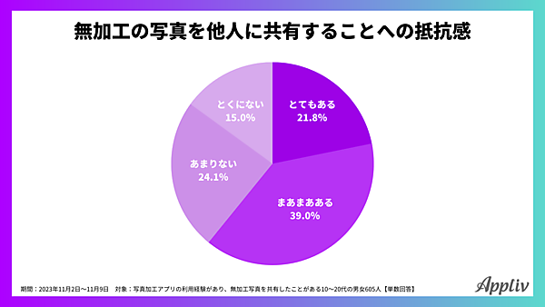 一方で「無加工の写真を他人と共有することに、抵抗感があるか」と聞くと、「とてもある」21.8%、「まあまあある」39.0%、「あまりない」24.1%、「とくにない」15.0%と、ある派がない派をやや上回っている。