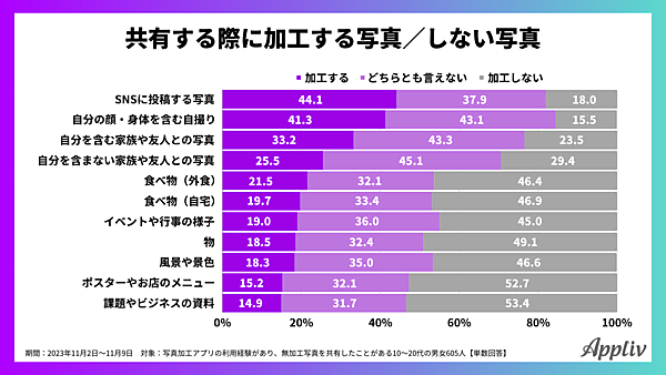 ナイルが運営するスマホ関連メディア「Appliv」は、「写真加工」に関する調査結果を発表した。写真加工アプリの利用経験と無加工写真の共有経験がある10~20代男女605人が回答している。