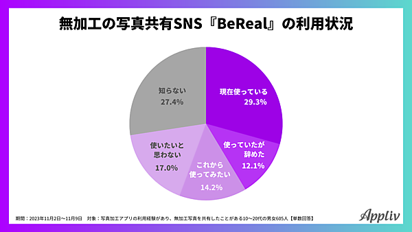 「BeRealの利用状況」を聞くと、「現在使っている」が29.3%と約3割。「過去に使っていた(現在は止めた)」の12.1%とあわせて、BeReal利用経験者は4割を超える。「これから使ってみたい」14.2%も存在する。