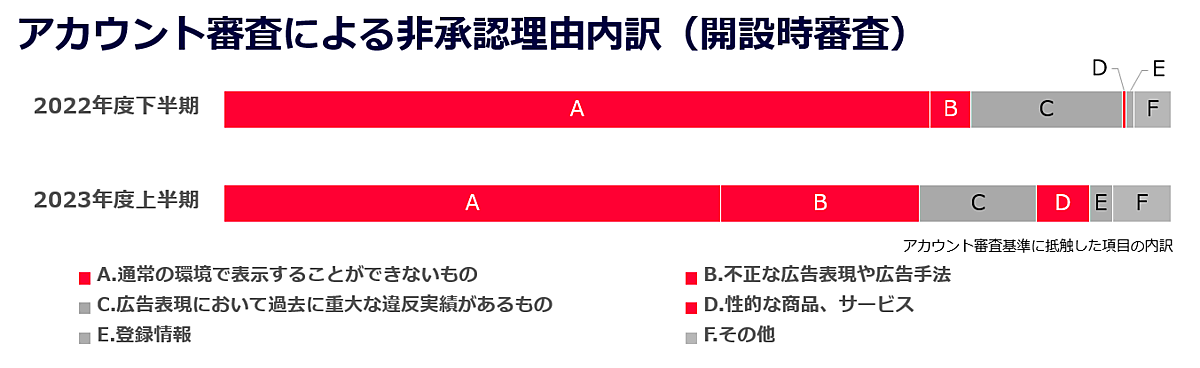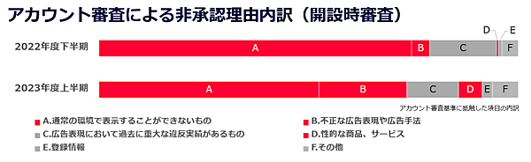 LINEヤフーは、「Yahoo!広告」の審査実績をまとめた2023年度上半期(4月1日~9月30日)の「広告サービス品質に関する透明性レポート」を12月19日に公開した。基準に抵触した広告素材の約4400万件を非承認にした。違反表現を繰り返したり、大量の非承認広告を入稿したりする広告アカウント自体も非承認・停止しており、3914件のアカウントを非承認にした。22年下半期の非承認数3824件と比較して約2%の増加した。