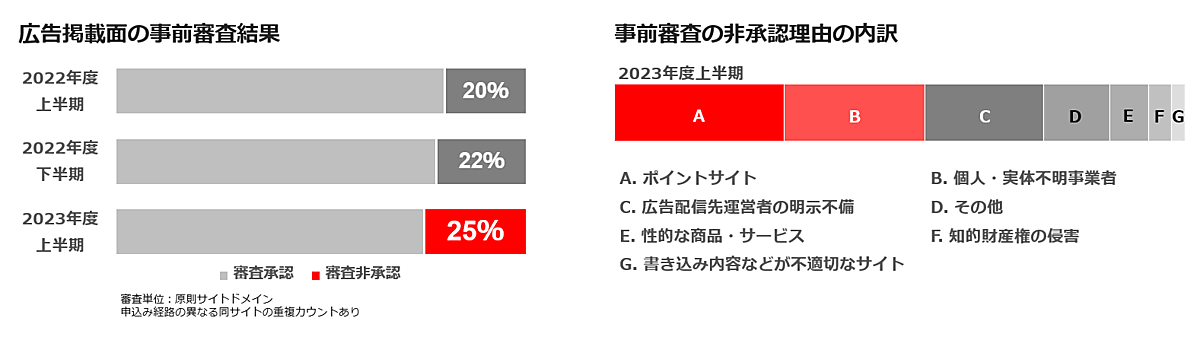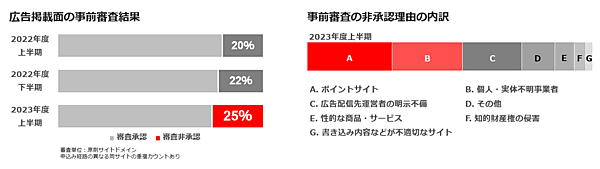 非承認理由では「不正な広告表現や広告手法」の基準での非承認が増加。増加傾向にあるのは「ダークパターン」のサイトだった。ユーザーが気付かない間に不利な判断・意思決定をしてしまうよう誘導する仕組みのデザインで、事実ではない内容を掲載してユーザーをだますおそれがある。「性的な商品、サービス」の基準での非承認も増加しており、電子書籍や出会い系サイトといった広告商材における非承認が目立った。