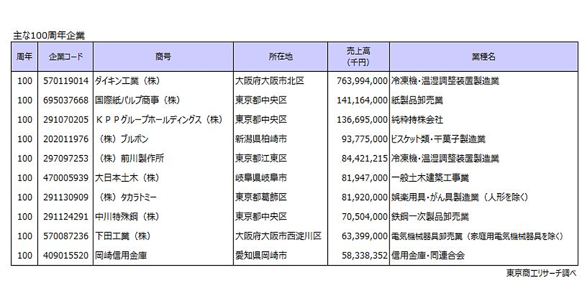 調査によると、2024年に創業100周年となる企業(1924年創業)は2,519社となった。空調機のダイキン工業や紙商社の国際紙パルプ商事、菓子メーカーのブルボン、産業用機械メーカーの前川製作所など、業界を代表する名門企業が並んでいる。