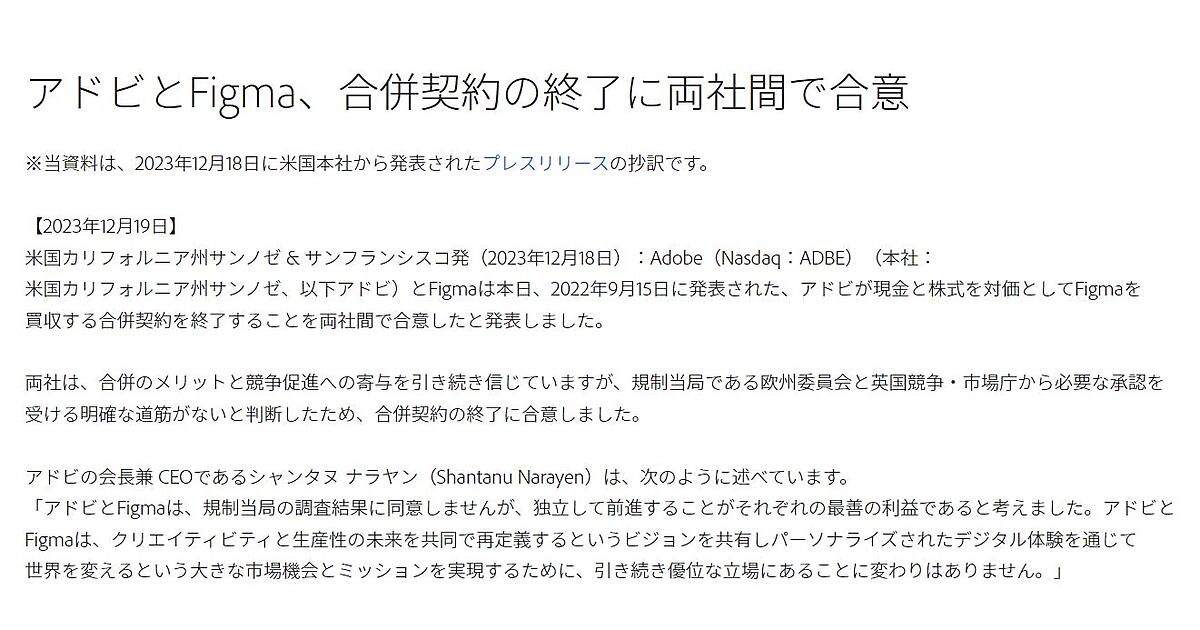 米国アドビと、デザインプラットフォーム事業の米国Figma(フィグマ)は、2022年9月15日に発表した合併契約の終了に合意したと12月18日(米国時間)に発表し、日本語訳を12月19日に公表した。アドビが現金と株式でFigmaを買収する計画だったが、欧州連合(EU)の執行機関の欧州委員会と英競争・市場庁の承認が得られないと判断したため。