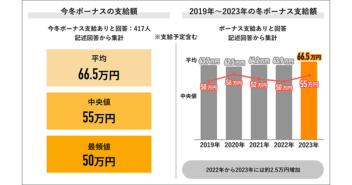 冬ボーナス支給額(支給予定額を含む)としては、平均支給額は66.5万円、中央値が55万円、最頻値が50万円という結果に。平均額の推移を見ると、2023年は約2.5万増加で過去最多となった。