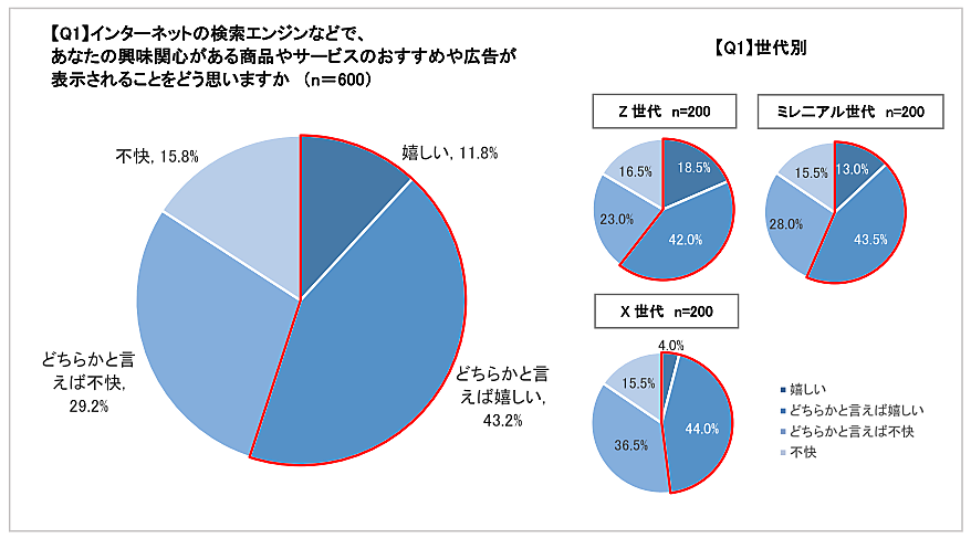 まず「インターネット上でおすすめ広告が表示されること」に対する感想を聞くと、「嬉しい」11.8%+「どちらかと言えば嬉しい」43.2%で、計55.0%が嬉しい派。世代別ではZ世代は過半数以上の60.5%、ミレニアル世代は56.5%、X世代は48.0%と若い世代ほど好反応だった。