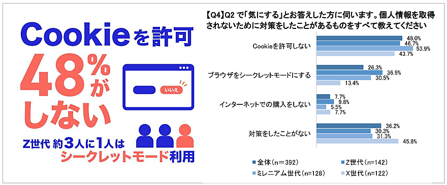 あわせて「個人情報取得を取得されないための対策」について聞くと、48.0%が「Cookieを許可しない」と回答。「ブラウザをシークレットモードにする」も26.3%存在した。一方で「対策をしたことがない」36.2%がかなり多い。