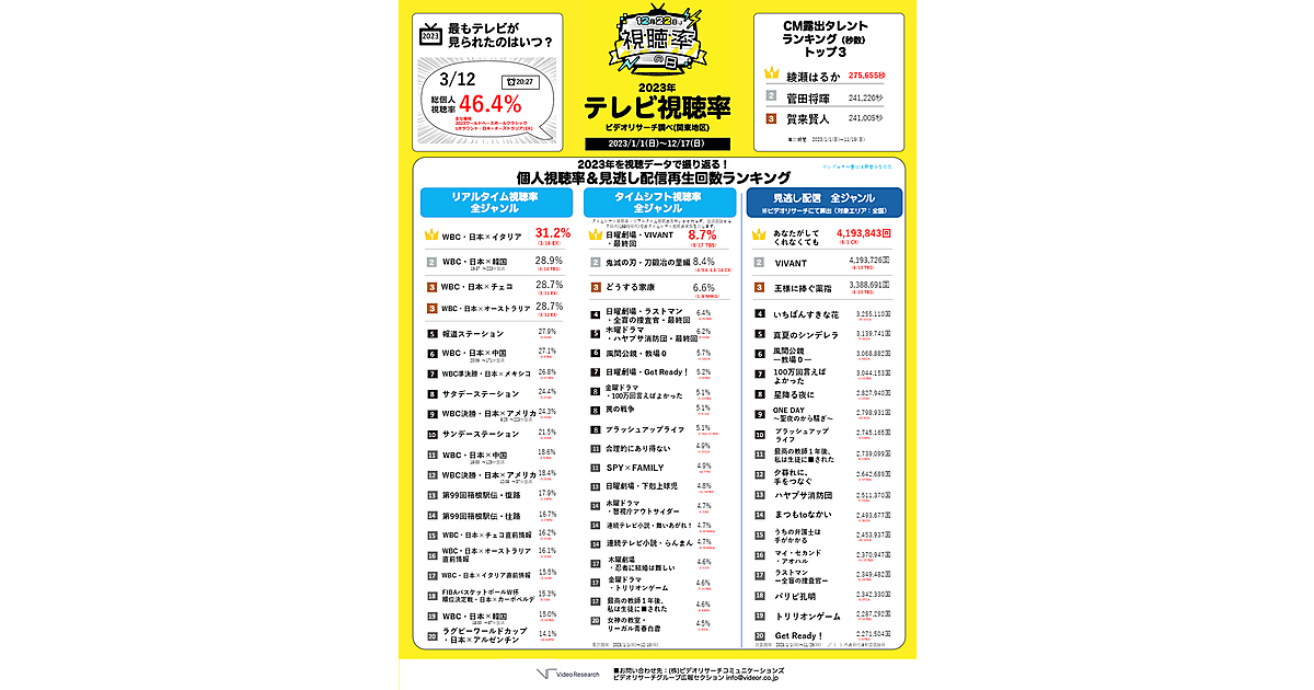 ビデオリサーチは、2023年のテレビ視聴率に関する調査結果を発表した。個人視聴率と見逃し配信の再生回数などについて調べている。