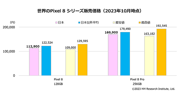 MM総研(MMRI)は、「世界のPixel販売価格調査」の結果を発表した。10月12日に発売開始されたGoogleのスマホ「Pixel 8」シリーズについて、各国のグーグルストアの価格を比較分析している。対象モデルはPixel 8 128GB(Pixel 8)、Pixel 8 Pro 256GB(Pixel 8 Pro)、5月に発売されたPixel 7a 128GB(Pixel 7a)、7月に発売された折り畳み式のPixel Fold 256GB(Pixel Fold)の計4モデル。