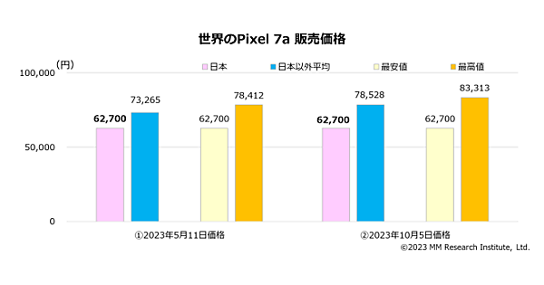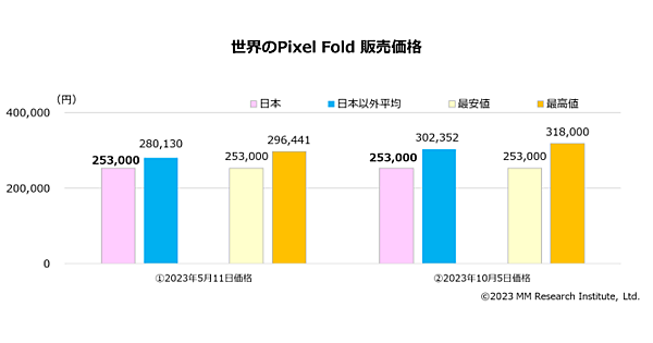 またPixel FoldとPixel 7aの販売価格を、販売時点と10月時点で比較。日本での価格はPixel Fold「253,000円」、Pixel 7aは「62,700円」でいずれも日本が最安だった。なおPixel Foldは日本、米国、英国、ドイツの4カ国のみでの販売。