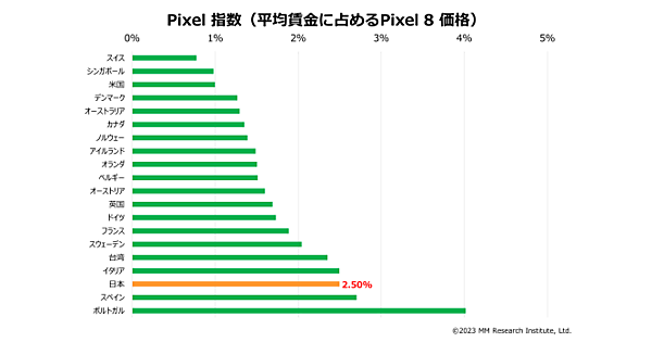 さらにPixelの購入のしやすさを、Pixel 8の販売価格が年間の平均賃金に占める比率を「Pixel指数」として算出した。日本のPixel指数(Pixel 8価格÷平均賃金)は「2.5%」で、大きい順でポルトガル「4.02%」、スペイン「2.7%」に次ぐ3位。収入を加味して考えると、Pixel 8は“ややお高い買い物”だと判明した。なおもっとも小さいのはスイス「0.77%」で、以下シンガポール「0.98%」、米国「1%」、デンマーク「1.27%」、オーストラリア「1.29%」が続いた。もっとも大きいのはポルトガルとなった。