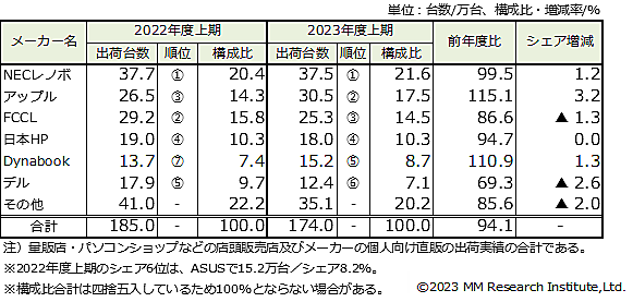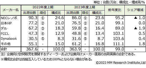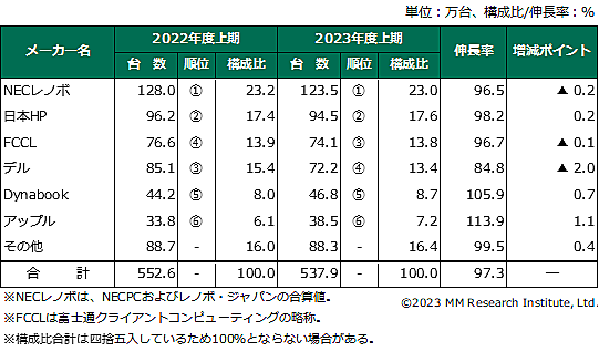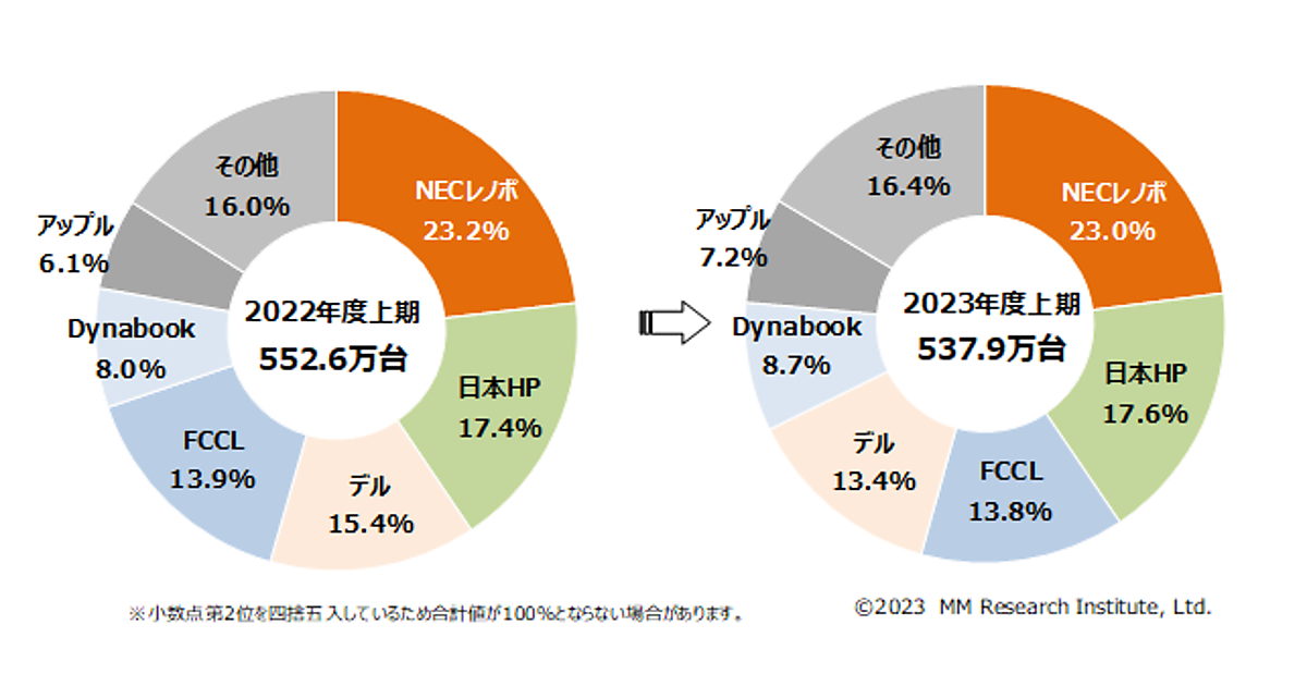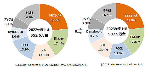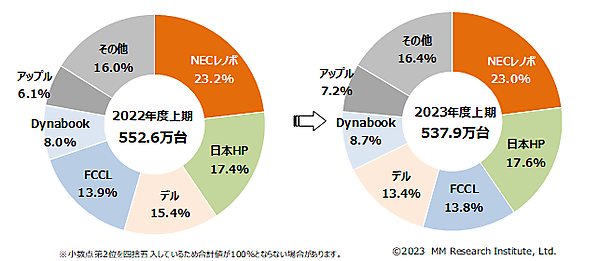 MM総研(MMRI)は、「2023年度上期 国内パソコン出荷台数調査」の結果を発表した。2023年度上期(2023年4~9月)が対象。