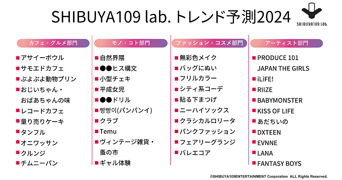 SHIBUYA109エンタテイメントが運営するマーケティング機関『SHIBUYA109 lab.』は、2024年のトレンド予測を発表した。独自ネットワーク「SHIBUYA109 lab. MATE」に所属する、around20(15~24歳)のZ世代女性443人がアンケートに回答している。