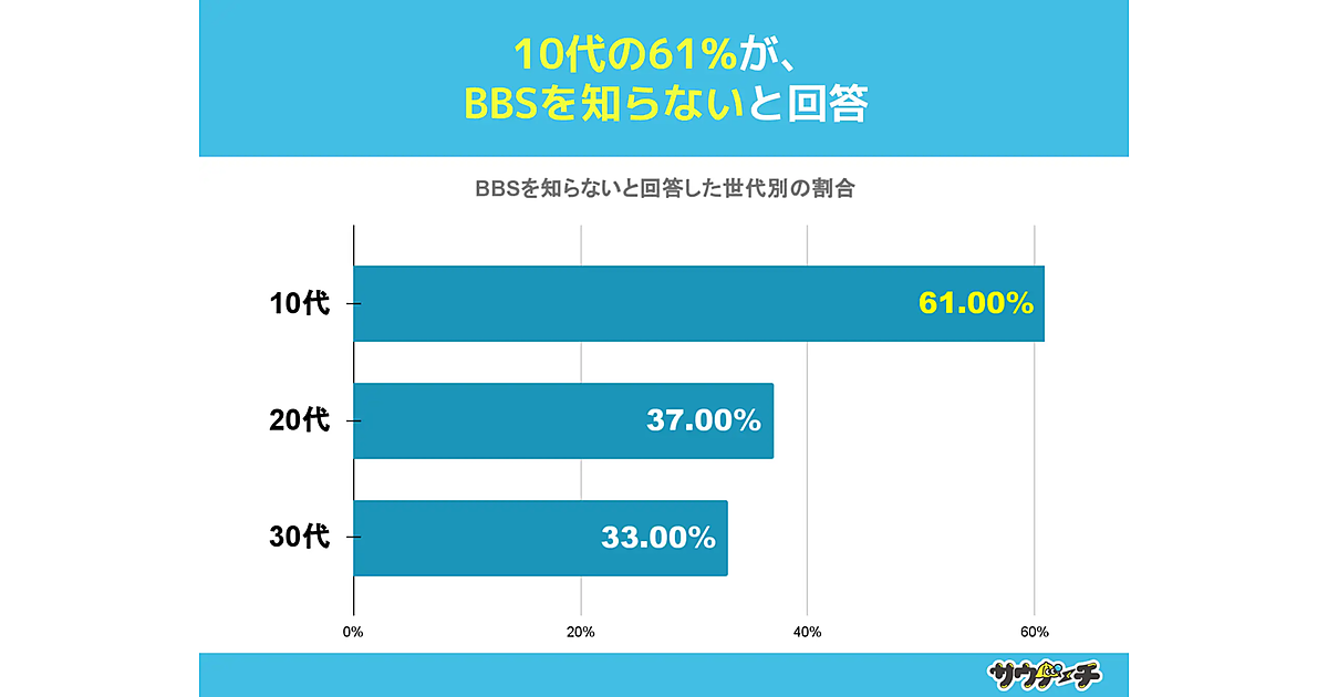 また、BBSを「知らない」と回答した割合を世代別でみると、10代の61%が最も高く、20代では37%、30代では33%という結果に。10代と30代では認知度に約1.8倍の差があった。