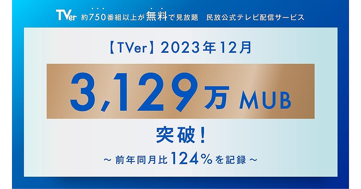 民放公式テレビ番組配信サービス「TVer(ティーバー)」を運営するTVerは、12月の月間ユニークブラウザ数(MUB)が3129万となり、初めて3100万超えた、と1月17日発表した。前年同月比では約124%だった。月間再生数も3億9800万回を突破して前年同月比約150%。インターネットに接続したテレビ端末のCTV(コネクテッドテレビ)での再生数が増えた。