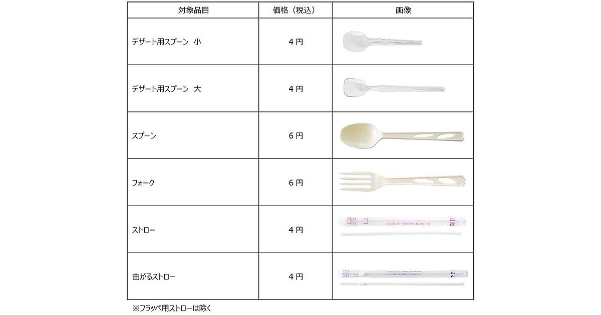 有料化するのはスプーン、デザート用スプーン大、デザート用スプーン小、フォーク、ストロー、曲がるストローの6品目。スプーンとフォークは6円(税込み)、他の4品目は4円(同)に設定した。ファミリーマートは2021年9月にスプーンを軽量タイプに変更し、2022年10月にはプラスチック製フォークの店頭での提供を原則取りやめた。