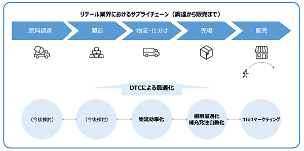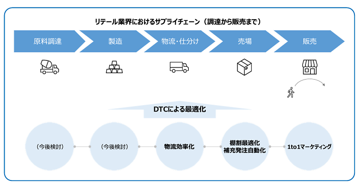 現実世界(リアル)から収集したデータをあたかも双子(ツイン)のようにコンピュータ上で再現するデジタルツインコンピューティング(DTC)技術を活用したサプライチェーンマネジメント(DTC-SCM)を目指す。トライアルが持つリテール業界の知見・店舗・商品販売データと、NTTが持つデータサイエンス分野の知見と技術を生かし、商品カテゴリごとに異なるサプライチェーンや購買傾向も加味して最適化する。