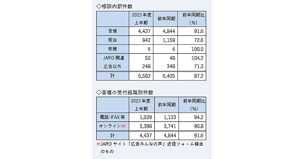 日本広告審査機構(JARO)は、2023年度上半期の審査状況を発表した。JAROが受け付けた苦情について、業種・媒体・内容別に集計を行っている。