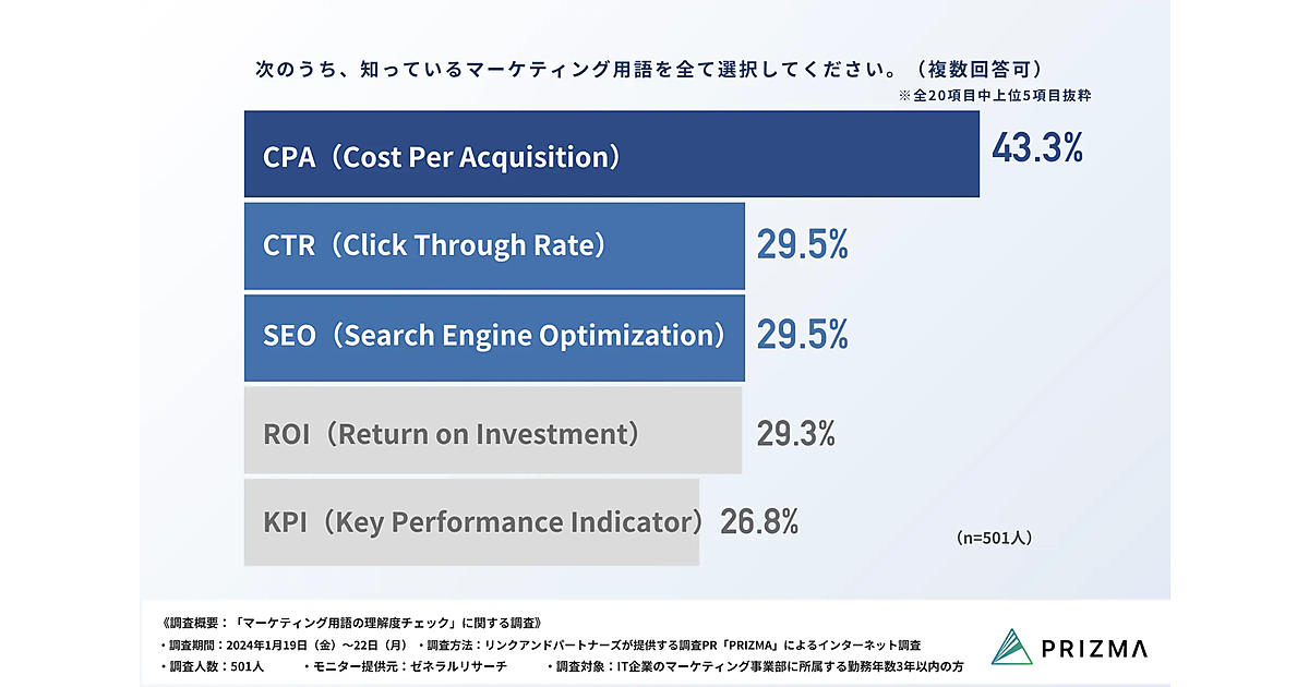 リンクアンドパートナーズは、「マーケティング用語の理解度チェック」に関する調査を実施した。IT企業のマーケティング事業部に所属する勤務年数3年以内の501名を対象に聞いている。