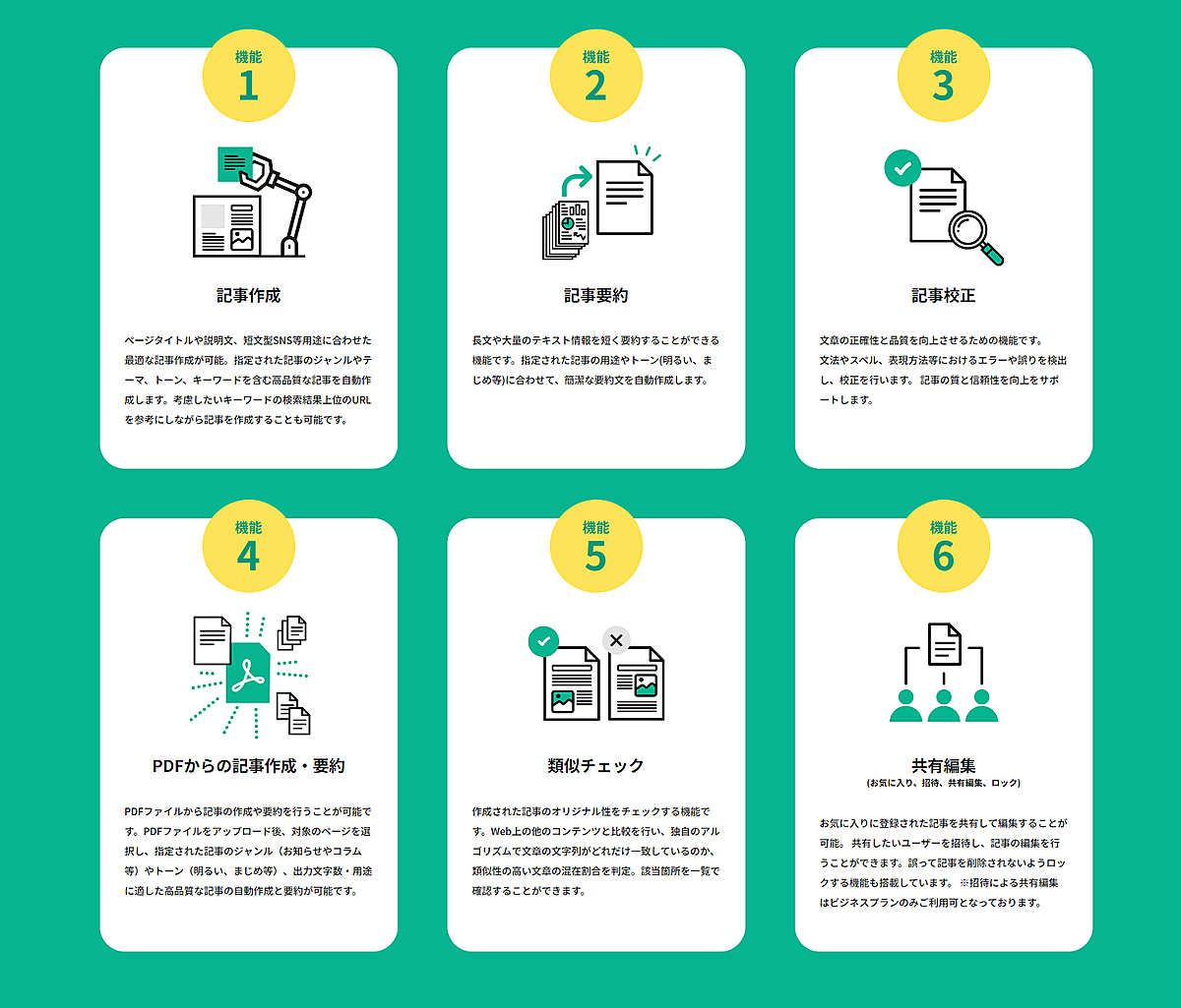 LENSAwriterの主な機能には、①記事作成、②記事要約、③記事校正、④PDFからの記事作成・要約、⑤類似チェック、⑥共有編集――がある。お知らせやコラム、サービス紹介などから掲載先の用途に合わせたトーンや文字数を選ぶシンプルな操作で記事を作成する。作成された記事の類似チェックや、複数ユーザーで編集する共有編集も可能。