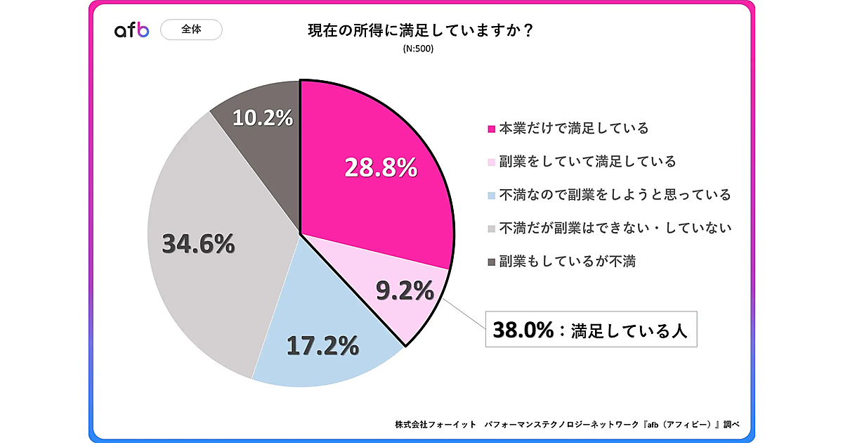 「afb(アフィビー)」を運営するフォーイットは、現在の所得に対する満足度調査を実施した。全国の10代~60代までの男女500人が回答している。