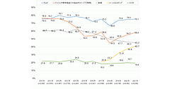 2018年と2023年を比較すると、「新聞」は15ポイント減少した一方で、「webサイト」は36ポイントの急増。「ソーシャルメディア」も21ポイント増加しており、シニア世代におけるスマホの急速な普及がうかがえた。
