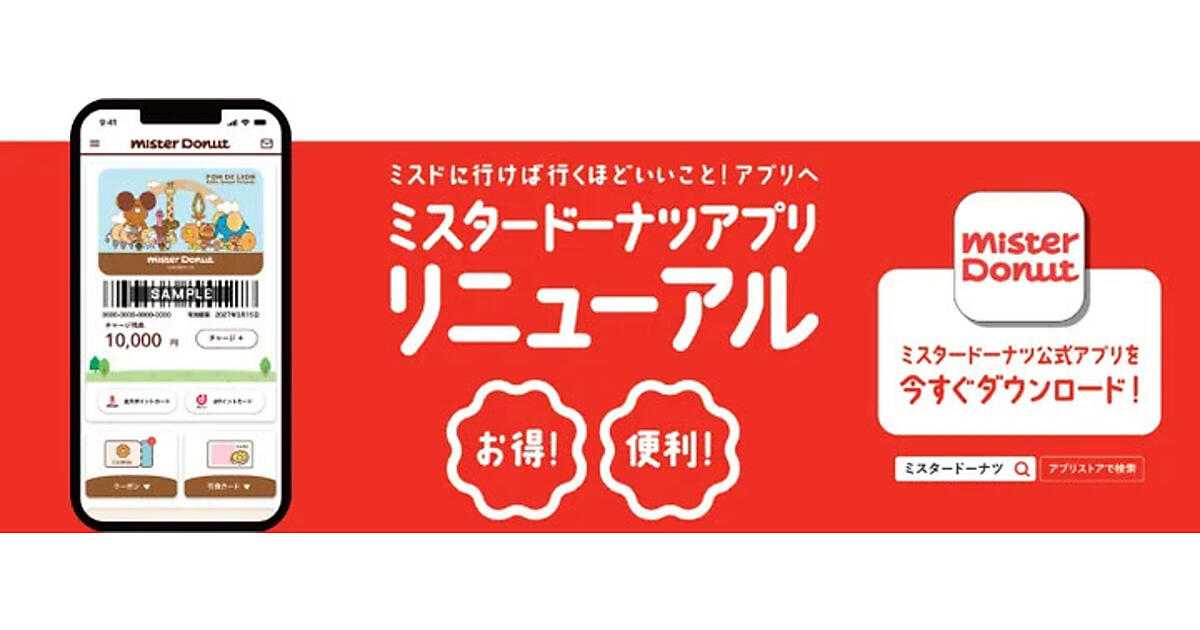 ダスキンは、同社が運営するドーナツチェーン「ミスタードーナツ(ミスド)」のスマートフォン向け公式アプリ「ミスタードーナツアプリ」をリニューアルした、と1月31日発表した。利便性の向上と、ミスタードーナツをより楽しんでもらうサービスの提供を目的にする。ユーザー向けの新たな特典プログラムを2月7日に始める。