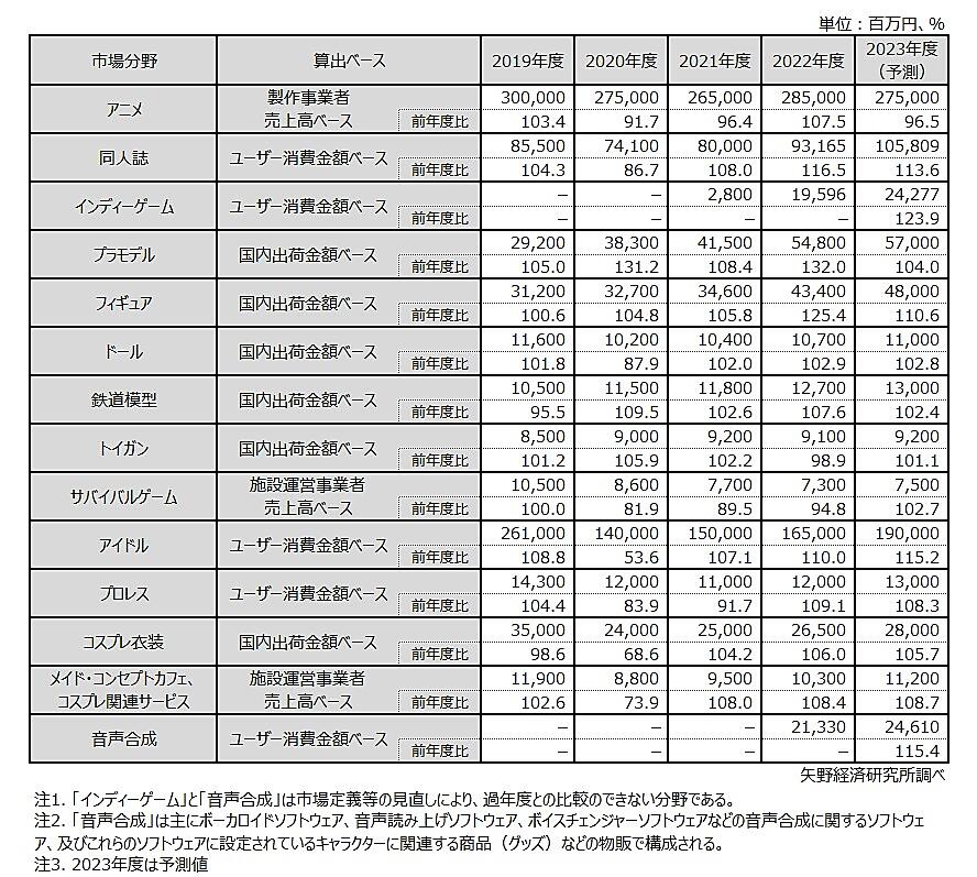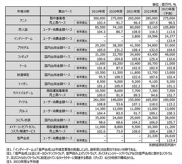 2023年度は、コロナ禍の行動制限が緩和されたことで、13市場(「同人誌」「インディーゲーム」「プラモデル」「フィギュア」「ドール」「鉄道模型」「トイガン」「サバイバルゲーム」「アイドル」「プロレス」「コスプレ衣装」「メイド・コンセプトカフェ、コスプレ関連サービス」「音声合成」)の成長が予測されている。一方「アニメ」は、外出時間が増加することにより視聴・契約数減少が見込まれる