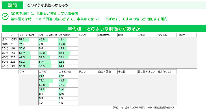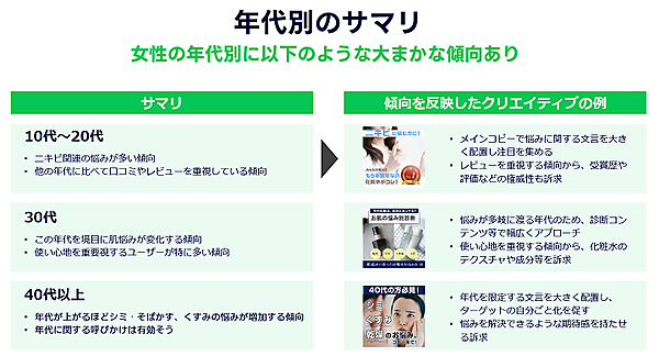 年代別で見ると、10~20代ではニキビやニキビ跡、毛穴の黒ずみといった悩みが多く、「クチコミやレビューがいいこと」が重視されていた。30代では、毛穴の開きや乾燥といった肌悩みが増え、使い心地が重視されていた。40代以上では、しみ・そばかすやたるみの悩みが増加傾向にあり、これらに焦点を当てた広告への反応が高いなど、年代別で顕著な違いが見られた。