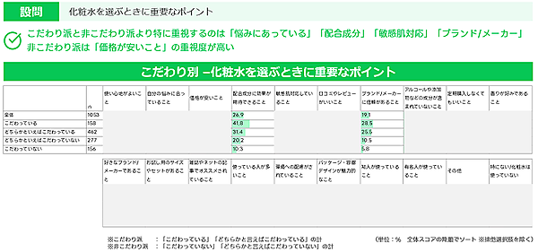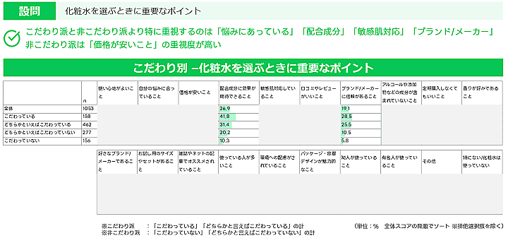 続いて、スキンケア用品を日頃こだわって選んでいるかいないかの回答結果をもとに、「こだわり派」と「非こだわり派」に分けて傾向をみてみると、「化粧水を選ぶときの重視点」で大きな違いがあり、「こだわり派」では「自分の悩みにあっている」「配合成分の効果」「ブランド/メーカーの信頼」といった項目が高かった。