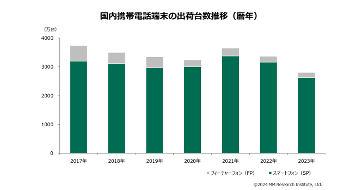 MM総研は、「2023年暦年(1~12月)の国内携帯電話端末の出荷台数」に関する調査を実施した。