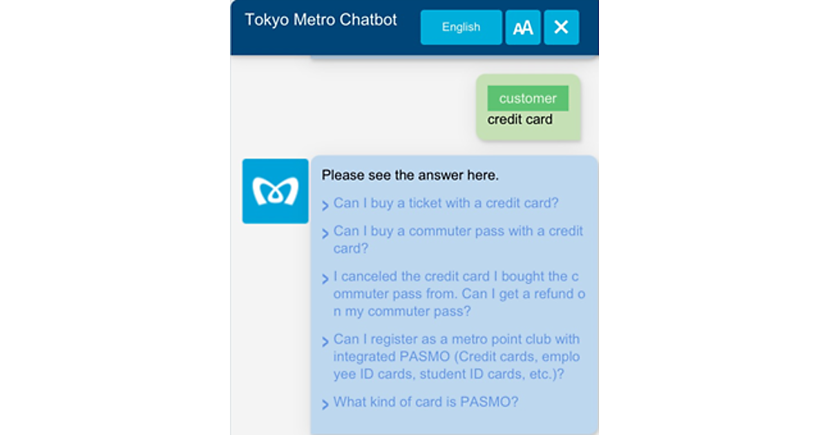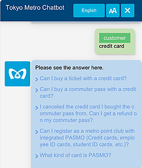 東京メトロは、同社の外国語のウェブサイトで、AI(人工知能)チャットボット(自動応答システム)サービス「東京メトロチャットボット」を2月15日に始める、と2月14日発表した。各言語サイトのチャットボットに質問を入力すると回答が自動で表示される。外国人からの問い合わせに迅速に応えるため、多言語化した。