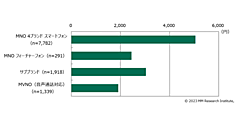 まず、携帯電話の月額利用料金を聞くと、スマートフォン利用者全体では平均4,476円で、2023年7月の調査から159円増となった。また、MNO4ブランド利用者では5,210円、楽天モバイルを除くMNOのフィーチャーフォン利用者では2,575円、サブブランド利用者では3,226円、MVNO利用者では2,001円となった。