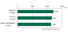 スマートフォンの平均利用時間は、1週間あたり1,215分(20時間15分)という結果に。携帯キャリア別にみると、MNO4社では1,280分、サブブランドでは1,128分、MVNOでは1,071分にのぼった。