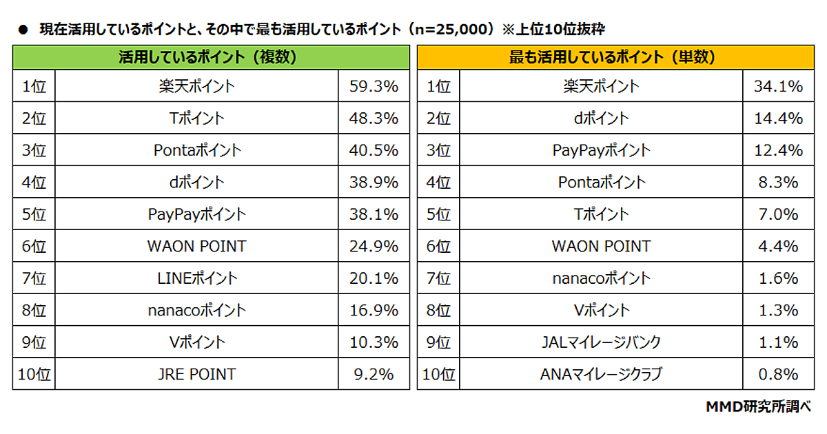 事前調査として「現在活用している共通ポイント(複数回答可)」と「そのなかでもっとも活用している共通ポイント」を聞くと、「現在活用している共通ポイント」は「楽天ポイント」59.3%、「Tポイント」48.3%、「Pontaポイント」40.5%が上位。「もっとも活用している共通ポイント」は「楽天ポイント」34.1%、「dポイント」14.4%、「PayPayポイント」12.4%が上位だった。