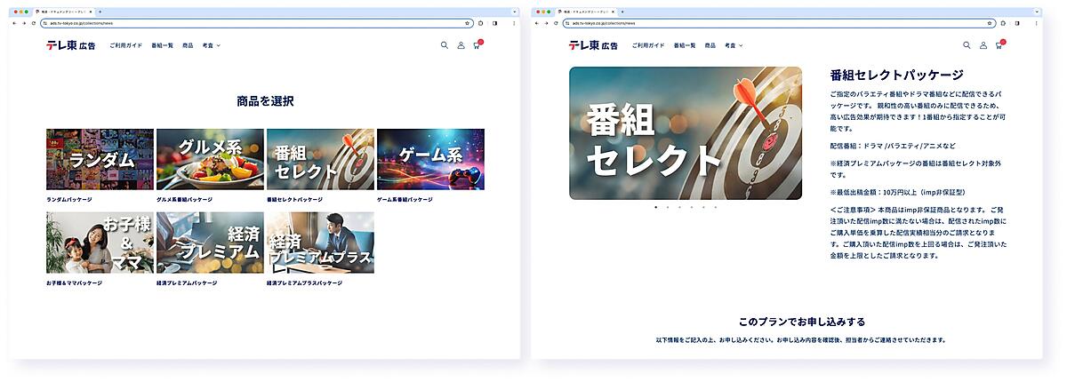 ほしい情報に24時間、いつでもアクセス可能で、例えば各番組の属性情報を見て、好みに合う番組への広告出稿のプランニングから見積もり、広告審査、申し込みまでをワンストップで行うことができる。担当につながるチャットアプリなどツールも用意。通常取引での広告商品だけでなく、番組を絞って10万円から出稿できるオンライン限定パッケージもある。広告UB(ユニークブラウザ)数は約700万UB。