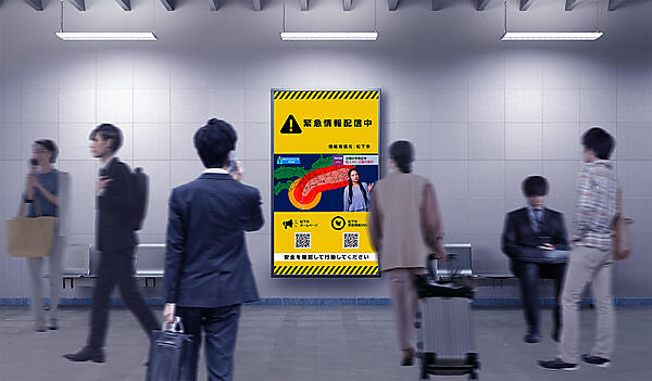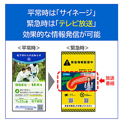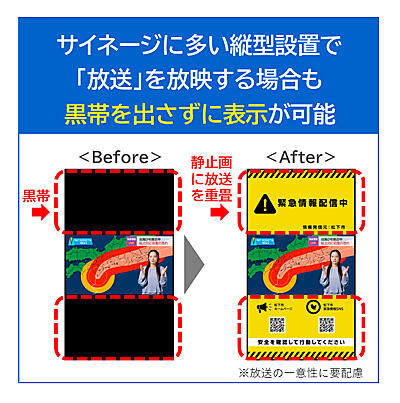 平常時の情報伝達、広告・販促情報の提供から、緊急時には災害の最新被害状況や避難に有効な情報展開まで効果的に発信できる。縦型のサイネージにテレビ放送を表示する際は、サイネージ用の静止画やHTMLにテレビ放送を重ねて表示。横長のテレビ放送を表示しながら、その上下に黒帯のデッドスペースを出さずにディスプレイ全面を有効活用でき、例えばテレビ画面と同時にQRコードを表示して自治体のWebサイトに誘導できる。