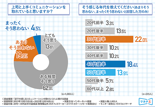 まず「上司と上手くコミュニケーションを取れていると思いますか?」と聞くと、「とてもそう思う」13.6%、「ある程度そう思う」62.0%で肯定派が多数だが、「あまりそう思わない」19.9%、「まったくそう思わない」4.5%も一定数存在。上司の年代別では30代前半が特に多く、自身と同年代ほどかえってコミュニケーションが難しいようだ。