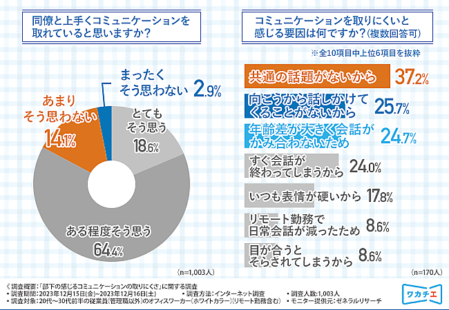 あわせて「同僚と上手くコミュニケーションを取れていると思いますか?」を聞くと、「とてもそう思う」18.6%、「ある程度そう思う」64.4%で上司よりはやや良好な関係を築いている。否定的な170人に「コミュニケーションを取りにくいと感じる要因は何ですか?」を聞くと、「共通の話題がないから」37.2%が最多で、「向こうから話しかけてくることがないから」25.7%、「年齢差が大きく会話がかみ合わないため」24.7%が続いた。